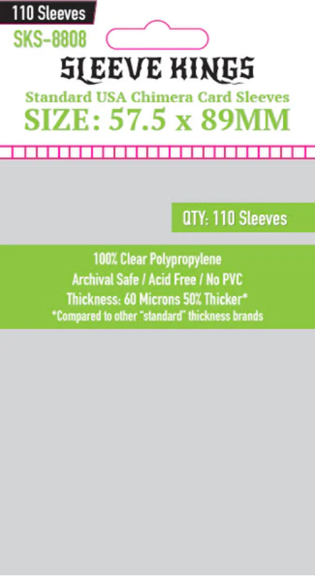 110 protectores Sleeve Kings (57.5x89 mm). Calibre 60. Ideal para cartas Americanas. Más protectores, más valor. ¡Compra el pack!